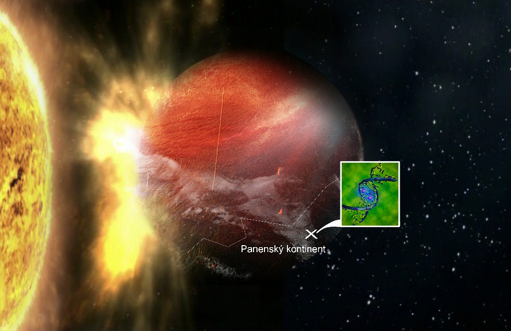 Po další noci strávené na oběžné dráze v moduluse na nás konečně usmálo štěstí. Na písečné, z půlky sopečné,takřka mrtvé planetě, se objevila plocha o velikosti malého kontinentu, která oplývala zelení a možná životem. Místo našeho přistání!