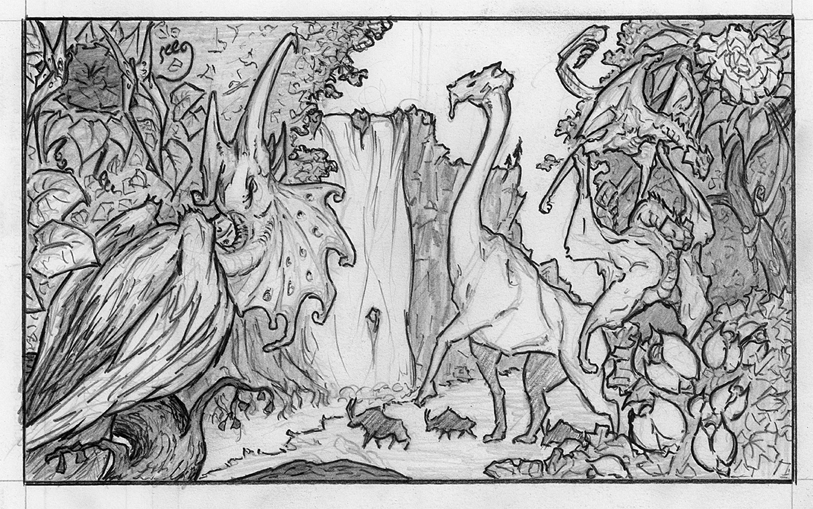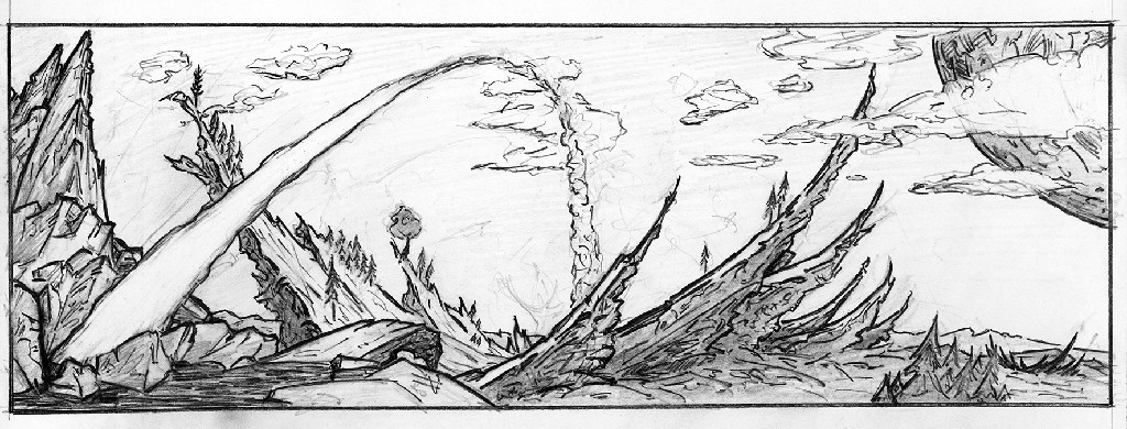 Skalnatý terén lemovaný stromy, které měří k deseti metrům v průměru a sahají až do nebes. Mezi stromy stopy po písku a prachu. Sopečná tornáda pomalu pohlcovala poslední zelený kontinent planety Terra.